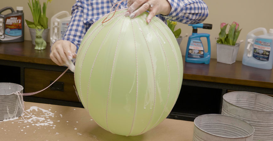 Spray the string and balloon evenly with a fabric stiffener. This will help hold the string into the egg shape after the balloon is popped. Let the balloon and string dry for 24 hours.
