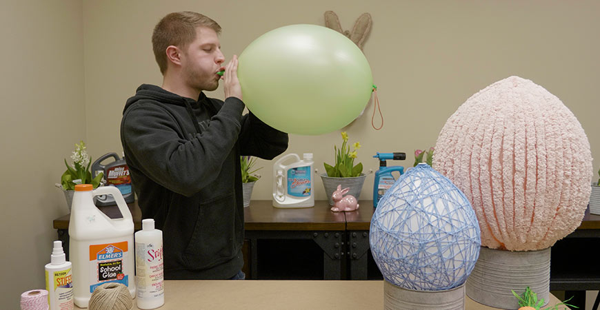 Create the base for your DIY Easter basket by blowing up a large balloon. Blow air into the balloon until a large egg shape forms. Tie off the balloon and set it aside.